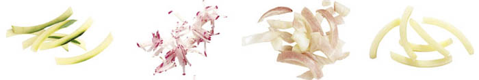 Разнообразие нарезки продуктов соломкой различной толщины и длины, а также нарезки лука полукольцами.