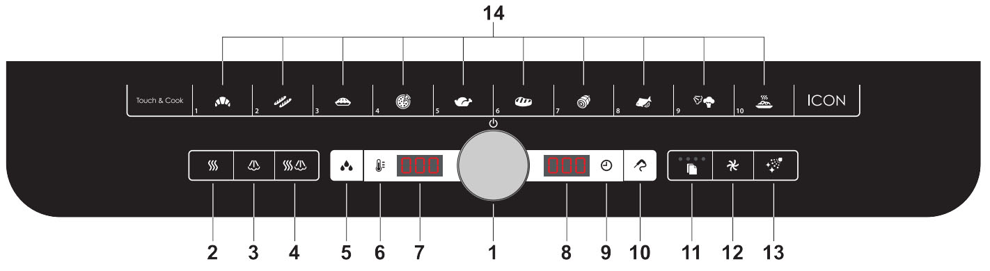 8 Дисплей показа времени приготовления (отсутствует/задано), показа температуры в середине продукта (действительная/заданная), показа кнопки Touch & Cook