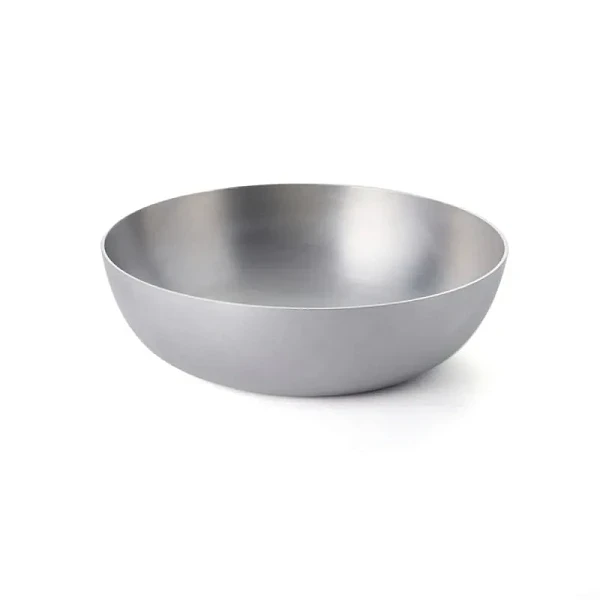 В работе используются четыре вида металлов: медь, латунь, мельхиор и алюминий. Медные изделия проходят лужение, чтобы безопасно контактировать с пищей, алюминиевые получают анодирование и характерную «мятую» текстуру, латунные отличаются глубокой полировкой, а мельхиоровые служат основой для изящных салфетниц на ножке.