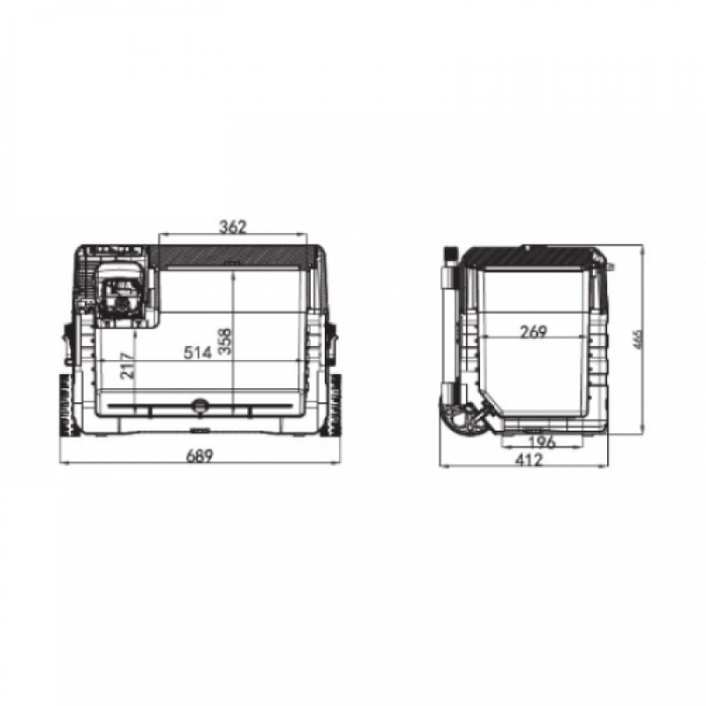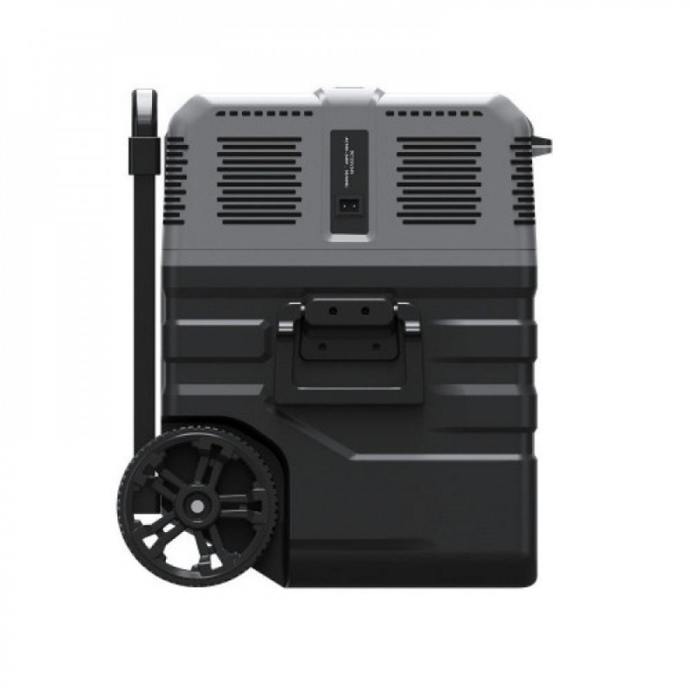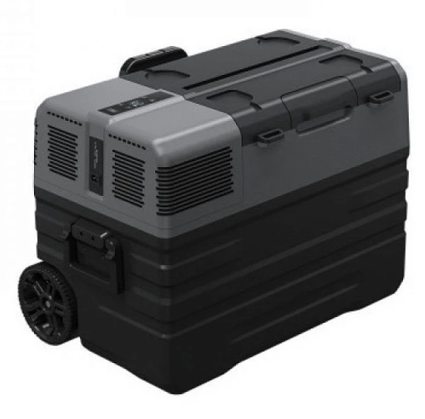 Вместительная модель в ударопрочном корпусе оснащена встроенными колесами и телескопической ручкой для транспортировки под открытым небом. Она подключается к прикуривателю и подходит для семейных путешествий, пикников, активного туризма, многодневных выездов на охоту и рыбалку. Для использования устройства на даче или дома можно приобрести специальный адаптер на 220 В.