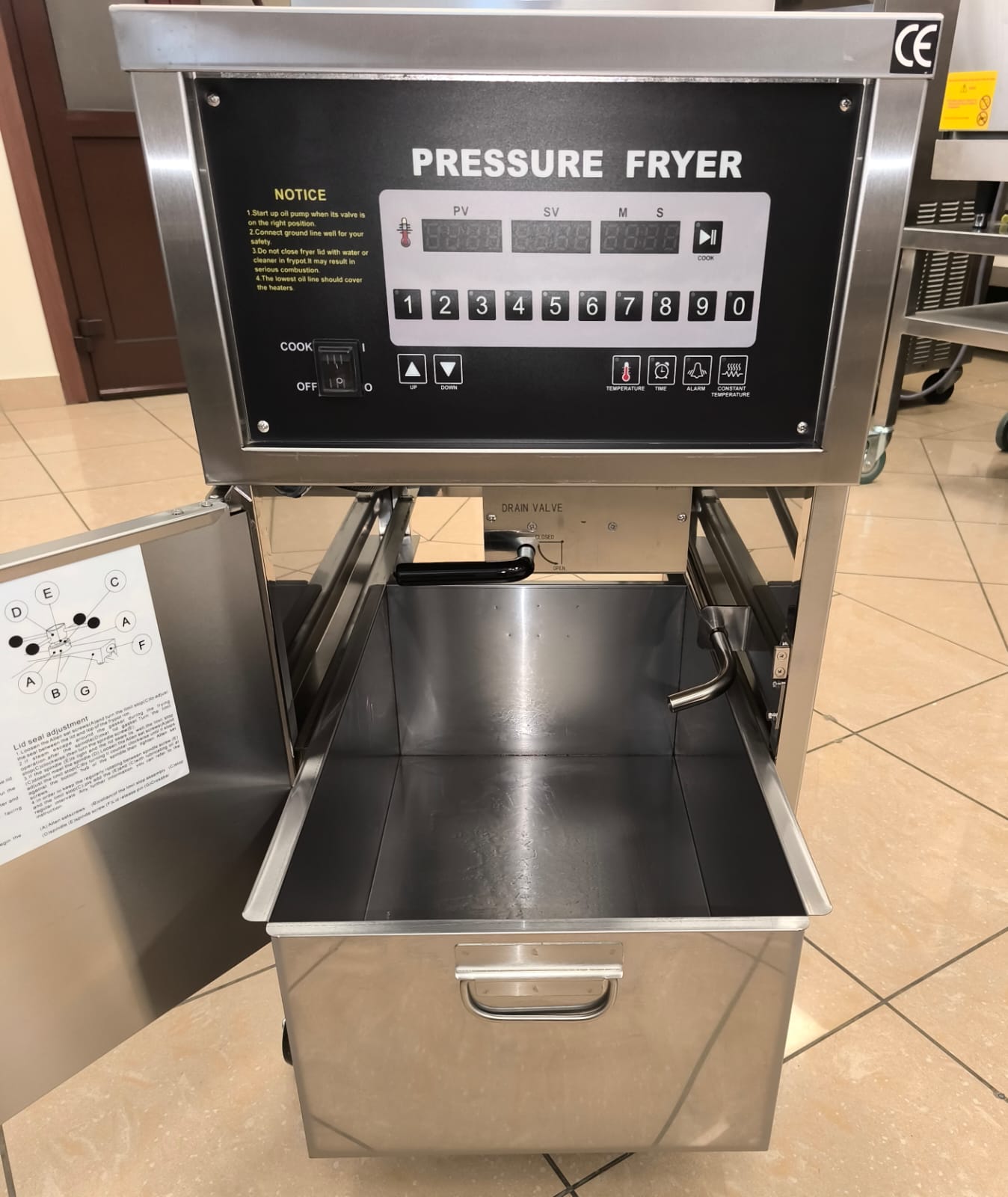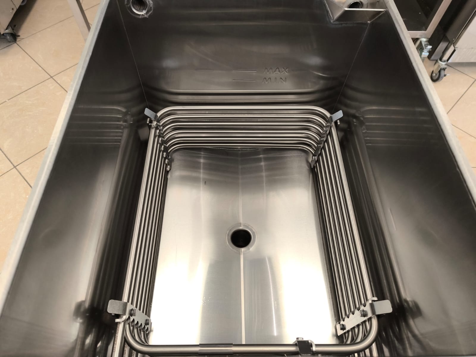 Фритюрница под давлением REDGASTRO MDXZ-24D предназначена для жарки продуктов под давлением. Продукт погружается в предварительно подогретое масло, и крышка аппарата герметично закрывается. Давление в рабочей зоне составляет около 1 атм. В самом начале процесса обработки из пищевых продуктов испаряется небольшое количество влаги. Ее дальнейшему высвобождению препятствует избыточное давление, которое помогает сохранить натуральные соки и предотвратить поглощение продуктом масла.