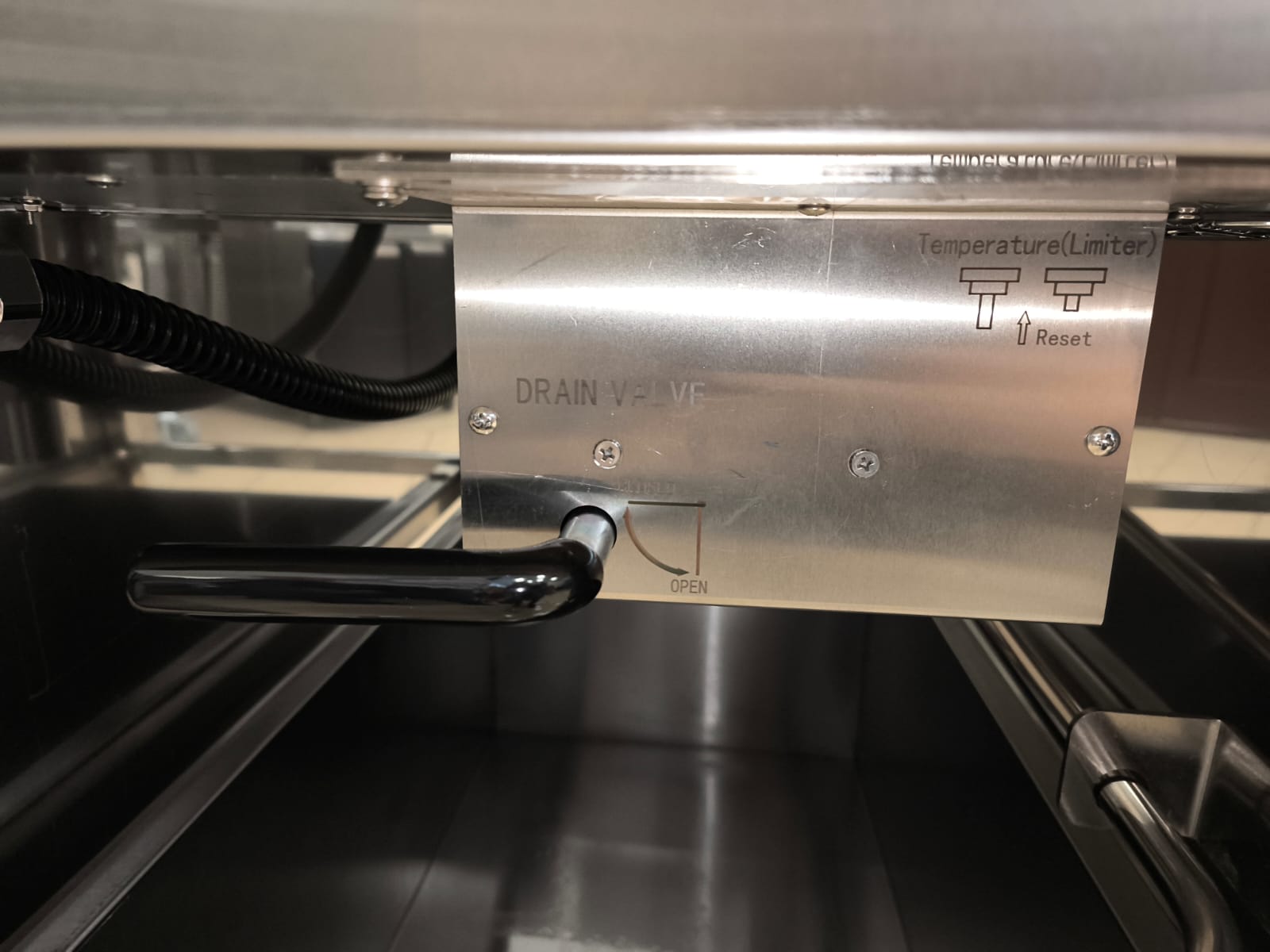 Модель оснащена прямоугольной ванной с крышкой, техническим отделением для слива масла с распашной дверью, панелью управления и манометром
