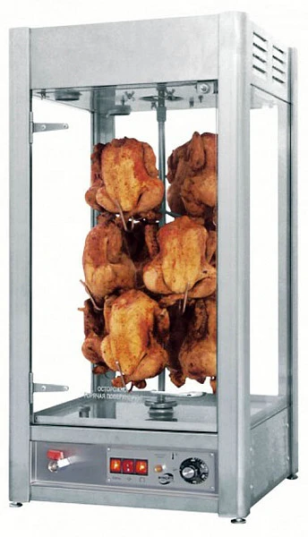 Гриль для кур электрический конвекционный панорамный вертикальный, с электромеханическим управлением, 1 камерой, вертелом-трансформером на 8, 12 и 15 кур, подсветкой изготовлен из нержавеющей стали.