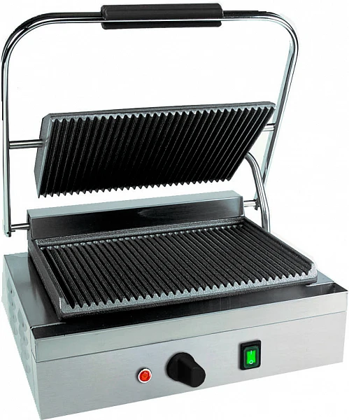 Состоит из двух нагревающихся поверхностей, открывающихся по принципу книжки. На нижнюю часть кладутся продукты, которые прижимаются верхней частью.