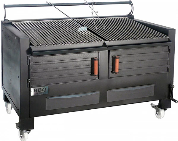 Оснащен колесами со стопорным механизмом, коллектором для сбора жира. Модель имеет систему установки положения колосника по высоте для регулировки интенсивности горения.