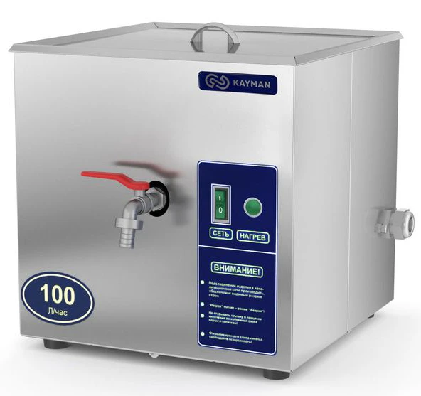 Кипятильник Kayman КЭ-01-100 А предназначен для непрерывного приготовления кипятка на предприятиях общественного питания. Горячая вода (кипяток), произведенная в кипятильнике, применяется при варке гарниров, овощей, сосисок, пельменей, при изготовлении горячих напитков и т. д. Кипяток может использоваться для стерилизации кухонной и столовой посуды, столовых приборов.