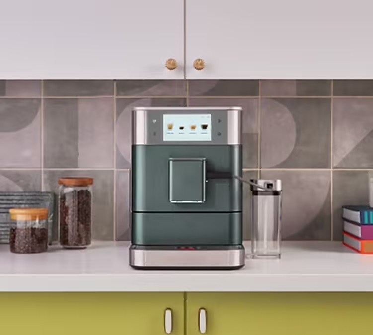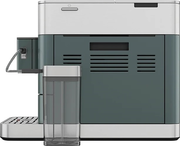 Модель оснащена встроенными насосом и капучинатором, диспенсером с 2 соплами, кабелем питания с вилкой и расположенной на фронтальной стенке электронной панелью с сенсорными функциональными клавишами и информативным цветным сенсорным дисплеем управления и индикации. Корпус прямоугольно ориентированной формы выполнен из металла и АБС-пластика с поверхностью оттенка можжевельник (Juniper), окантовки по периметру верхней части и основания с серебристой поверхностью, жернова кофемолки – из закаленной стали.