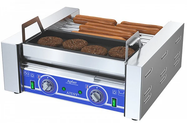 Комби-гриль для обжарки сосисок и котлет Atesy Арбат КГ-7.1П-440-01 предназначен для обжаривания сосисок, сарделек, мясных и рыбных батончиков цилиндрической формы (или близкой к цилиндрической), диаметром не менее 18 мм. и обжаривания полуфабрикатов котлет.
