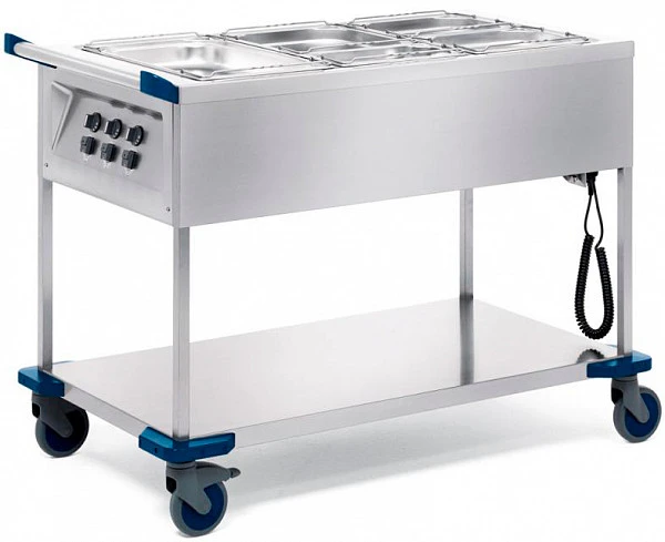 Конструкцией мармита не предусмотрено наличие теплового шкафа, однако данная модель оборудована вместительной нижней полкой, которая позволяет перевозить чистую или грязную посуду, столовые приборы и продукты, не требующие постоянного температурного контроля.