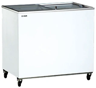 Низкотемпературный ларь с прямым стеклом D 300 С предназначен для хранения продуктов при температурном режиме -12°…-22°.