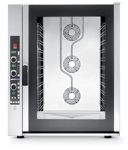 Внутреннее освещение рабочей камеры позволяет следить за процессом приготовления. Двойное термостойкое стекло обеспечивает обзор блюд, благодаря чему отпадает необходимость открывать дверь пароконвектомата.