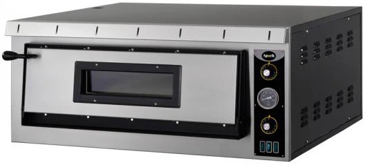 Наличие смотрового окна и встроенной подсветки в виде галогеновой лампы позволяет следить за процессом приготовления без необходимости открывания дверцы. Оснащена двумя механическими термостатами для независимого регулирования нагрева верхних и нижних ТЭНов (по 3 сверху и снизу) и двумя термометрами, которые позволяют контролировать температуру внутри камеры. Под выполнен из шамотной глины.