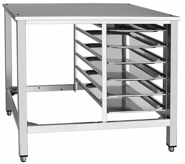 Подставка Abat ПК-6М является вспомогательным оборудованием и предназначена для установки пароконвектомата типа ПКА на столешницу и размещения шести гастроемкостей GN 1/1 на держателях полок.