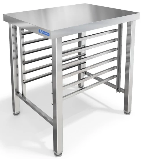 Столешница выполнена из нержавеющей стали AISI430, разборный каркас из стали AISI 430 (труба) обеспечивает повышенную прочность конструкции, 1 ряд направляющих на 7 уровней GN 1/1 .