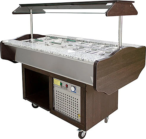 Салат-бар охлаждаемый Пищевые технологии СОЭП-ШС-Г для "Шведского стола" на 12 гастроемкостей, серия Гранит предназначен для кратковременного хранения и демонстрации холодных закусок, а также для раздачи их потребителю. Стол охлаждаемый устанавливается на предприятиях общественного питания отдельно или в линию прилавков самообслуживания.