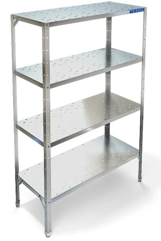 Разборный каркас выполнен из уголка 40х40 мм из нержавеющей стали AISI 304 толщиной 2 мм, перфорированные полки - из нержавеющей стали AISI 304.