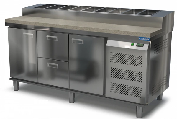 Стол для пиццы Камик СОП-2218576К используется на предприятиях общественного питания и торговли для хранения пиццы, салатов, сэндвичей и других блюд и ингредиентов к ним в охлажденном состоянии.