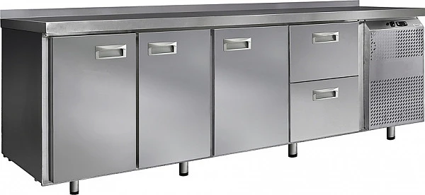 Стол морозильный Финист НХС-700-3/2 предназначен для хранения предварительно замороженных пищевых продуктов на предприятиях общественного питания и торговли. Модель оснащена расположенным сбоку агрегатным отсеком, столешницей с задним бортом, 3 холодильными камерами с распашными дверцами, 2 выдвижными ящиками, устойчивыми ножками с подпятниками, кабелем питания с евровилкой и кнопочной панелью управления с цифровым дисплеем. Цельнозаливной корпус выполнен из высококачественной нержавеющей стали.
