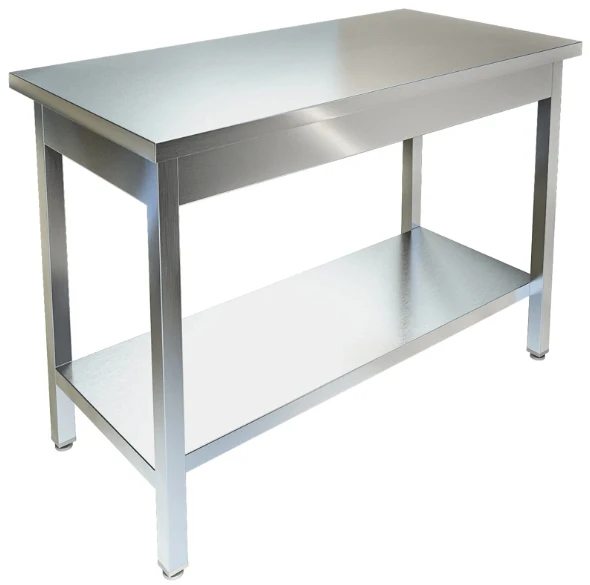Стол производственный без борта, столешница из нержавеющей стали марки AISI 304 толщиной 0,8мм. Каркас разборный из уголка 40х40 толщиной 2мм, покрытого порошковой краской серого цвета. Сплошная полка-накладка из нержавеющей стали марки AISI 430 толщиной 0,8мм. Регулируемые опоры.