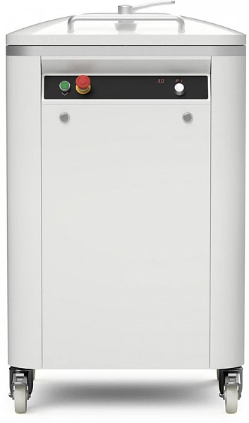 Машина с гидравлическим приводом, с цилиндром для прессования. Панель управления с возможностью регулировки времени прессования. Кнопка очистки дежи. Возможность сохранить до 9 различных программ.