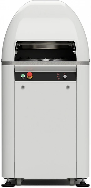 Машина с гидравлическим приводом, с двумя цилиндрами для прессования, одним цилиндром для разрезания и одним — для округления. Панель управления с возможностью регулировки времени прессования, округления и раскрытия формовочной камеры. Кнопка очистки ножей. Возможность сохранить до 9 различных программ.