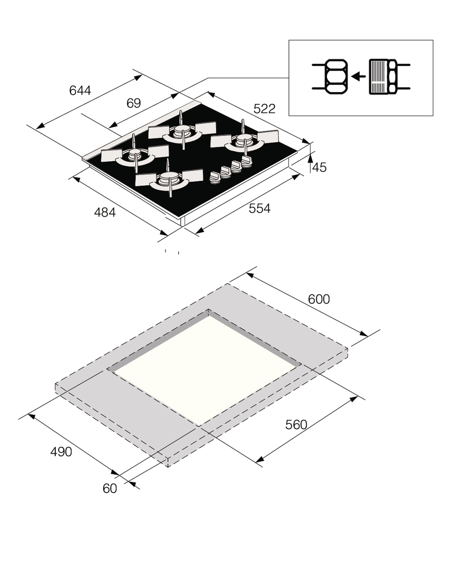 Ширина панели составляет 64.4 см, что делает её достаточно компактной, но в то же время многофункциональной. Благодаря раздельным чугунным решеткам, которые обеспечивают стабильность и прочность при использовании кастрюль и сковород, вы можете быть уверены в надежности данной варочной панели.