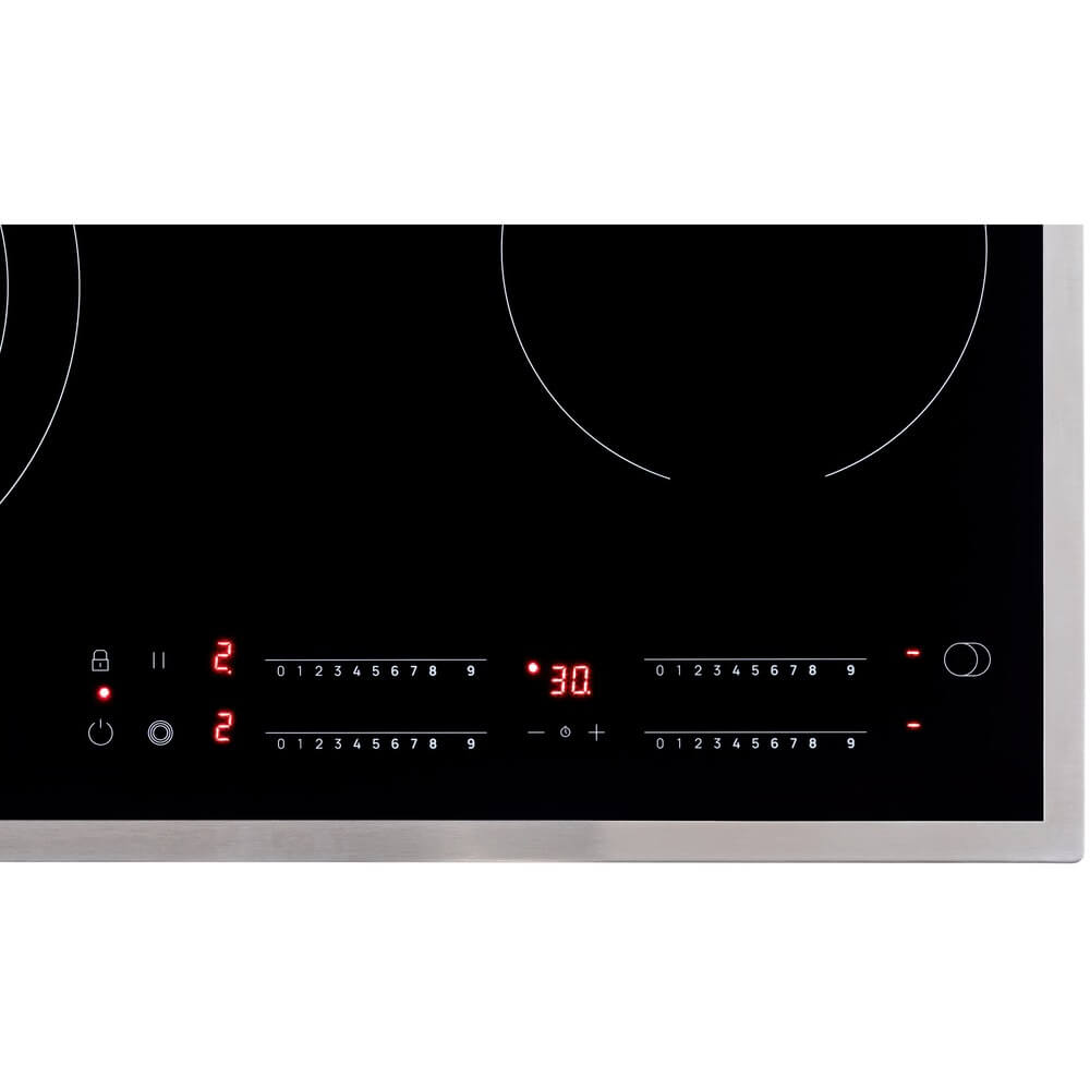 Встраиваемая стеклокерамическая электрическая варочная панель черного цвета с металлическими краями станет стильным и практичным решением для вашей кухни.