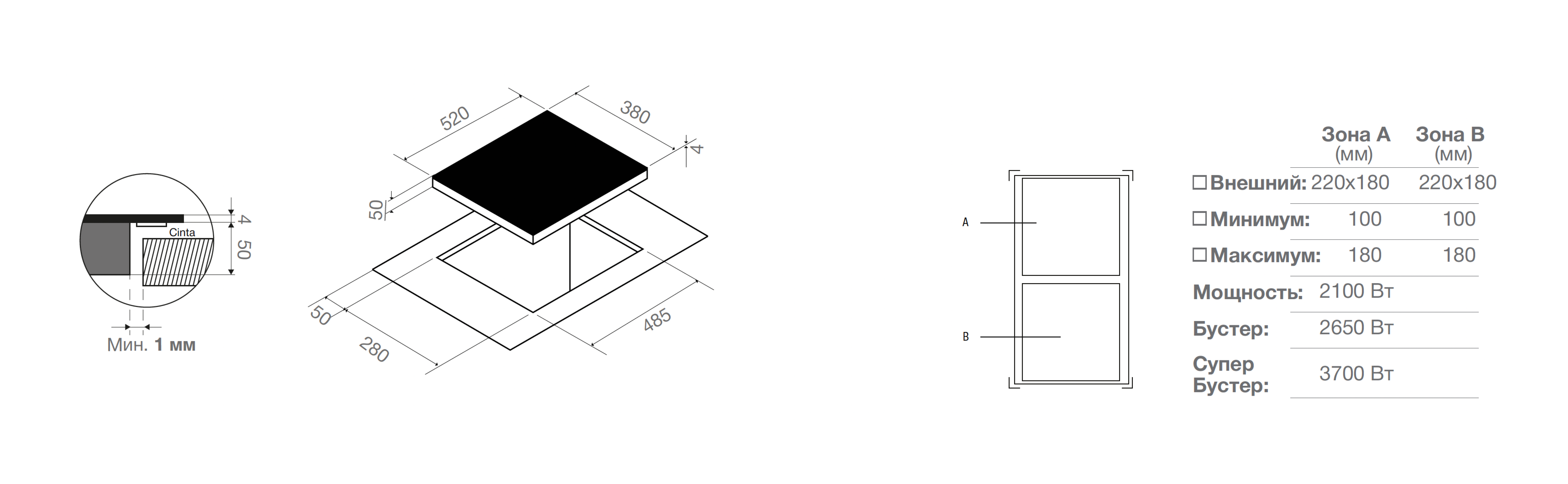 Максимальная мощность независимых варочных зон (в режиме Booster / SuperBooster): 2,1 (2,6 /3,7) кВт