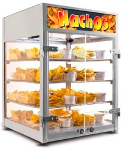 Три полки-решетки и нижняя поверхность позволяют вмещать до 24 стандартных подносов с чипсами и соусом.